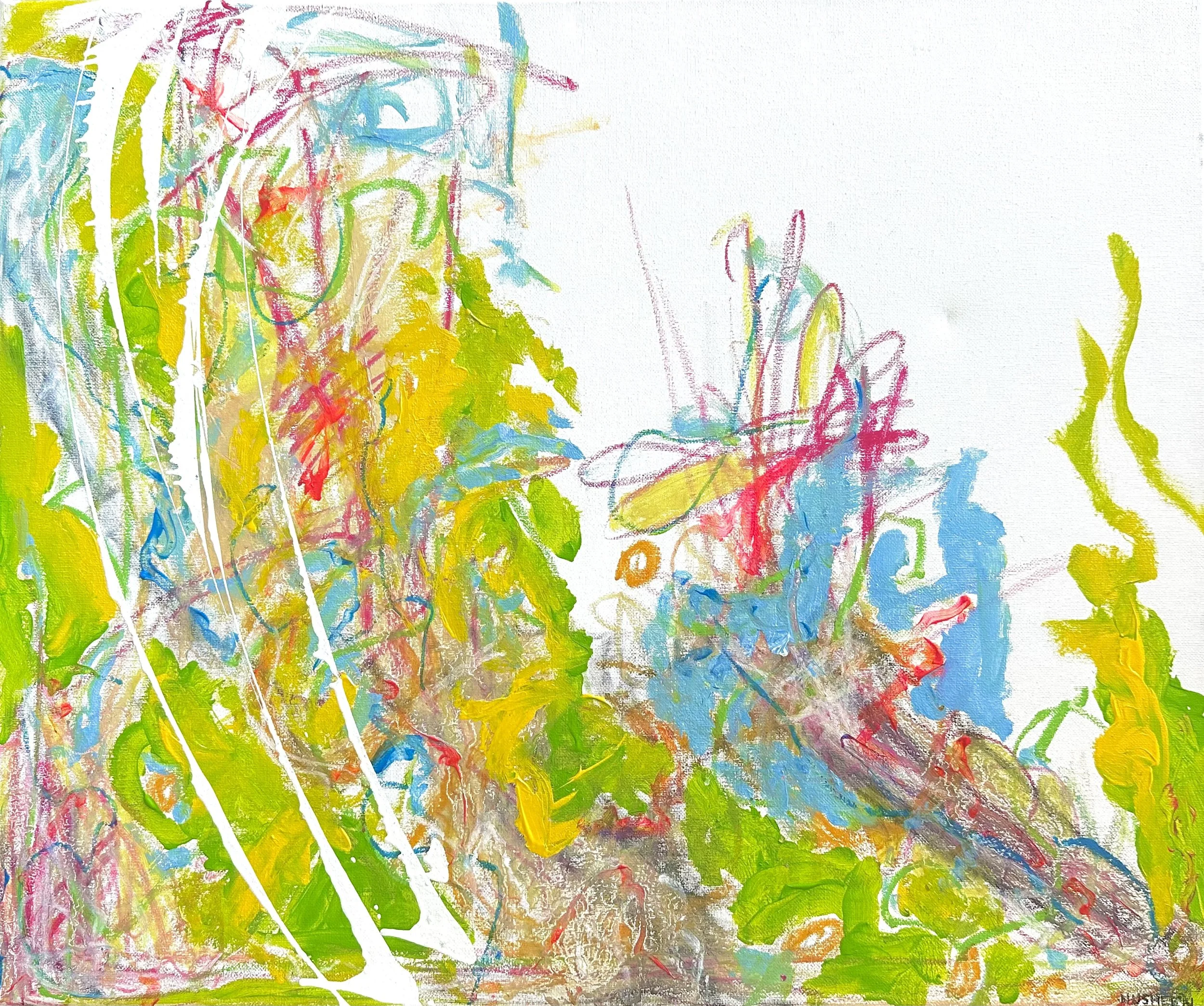 Abstract colorful painting with splashes of yellow, blue, green, pink, and white, featuring chaotic brushstrokes and overlapping lines.