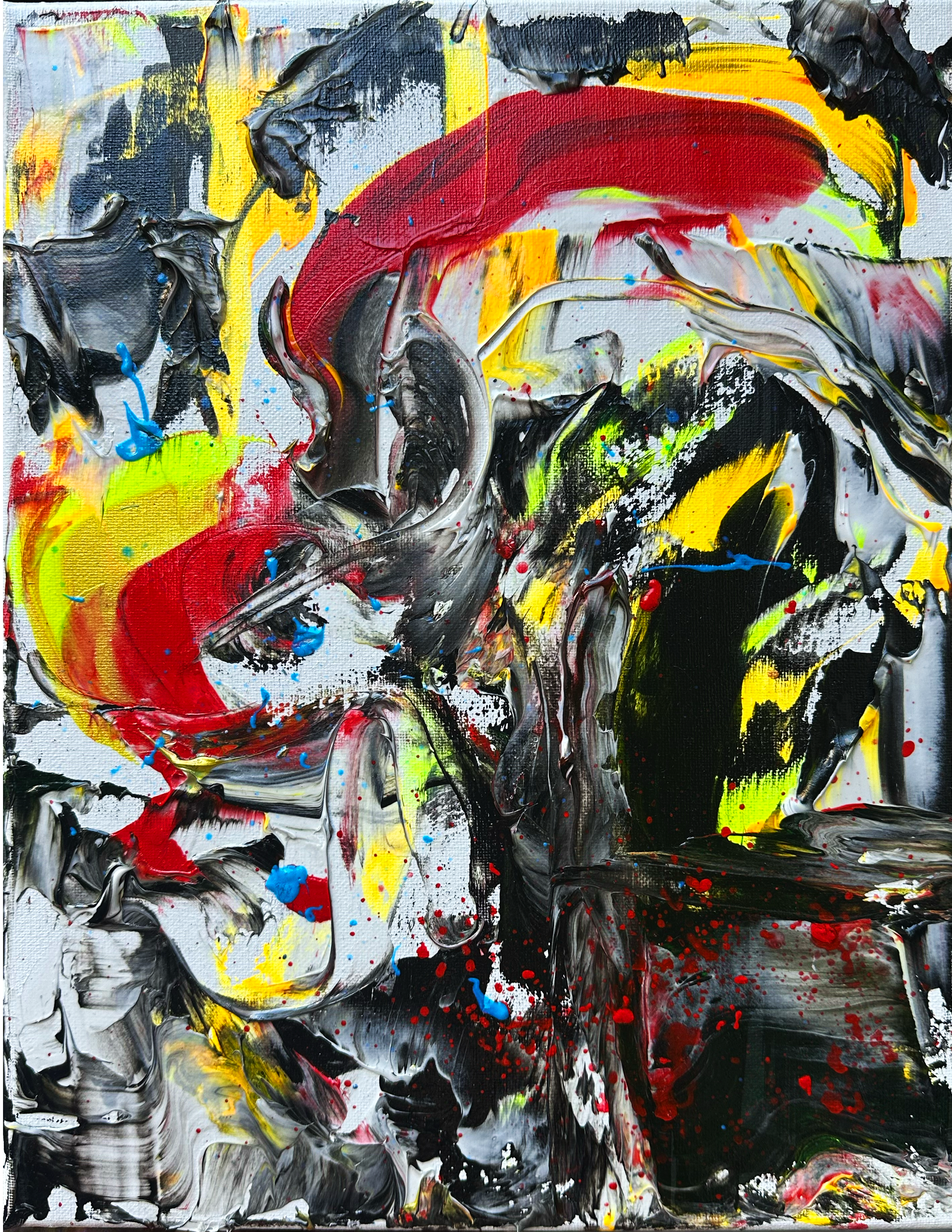 Abstract painting with bold brushstrokes, featuring bright yellow, red, blue, white, and black colors, with swirling and splattered patterns.